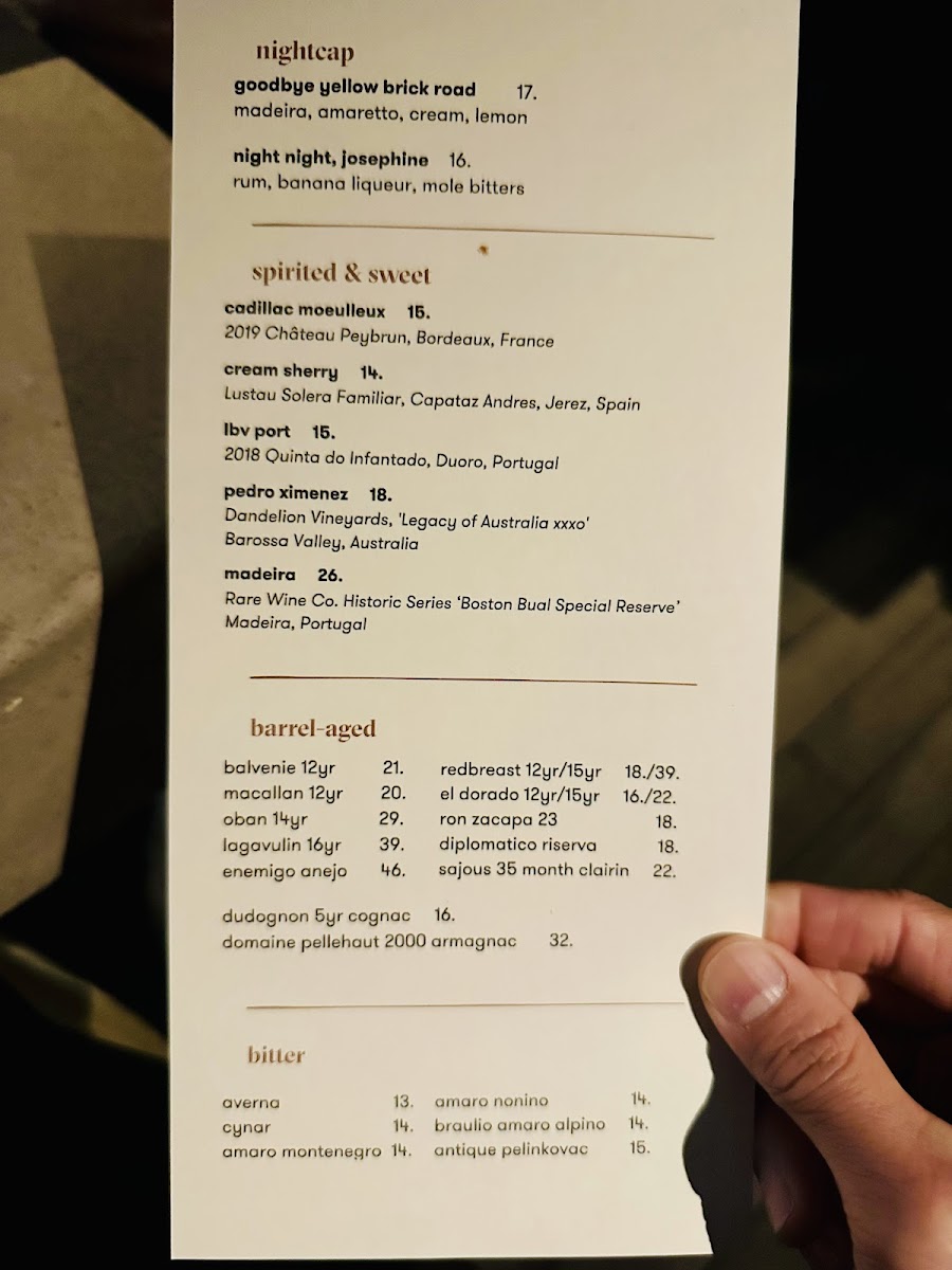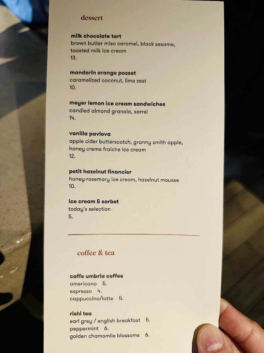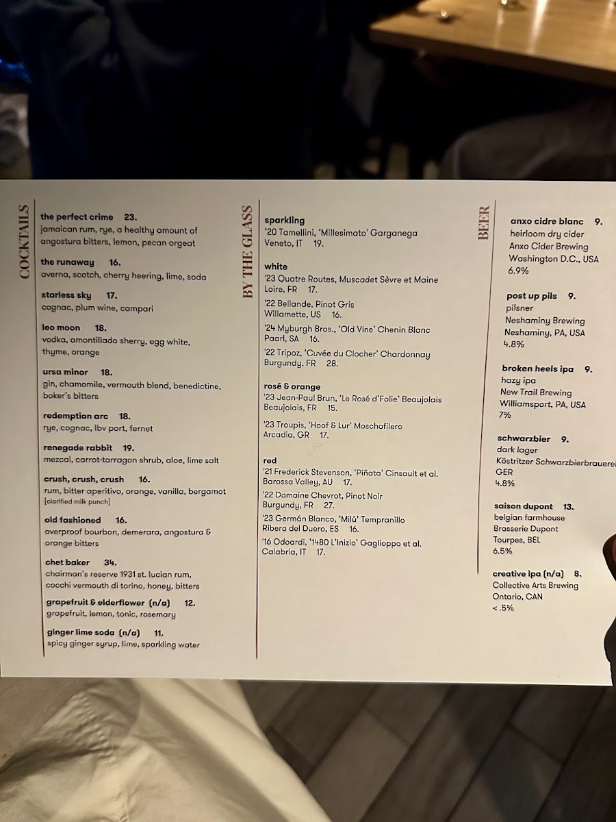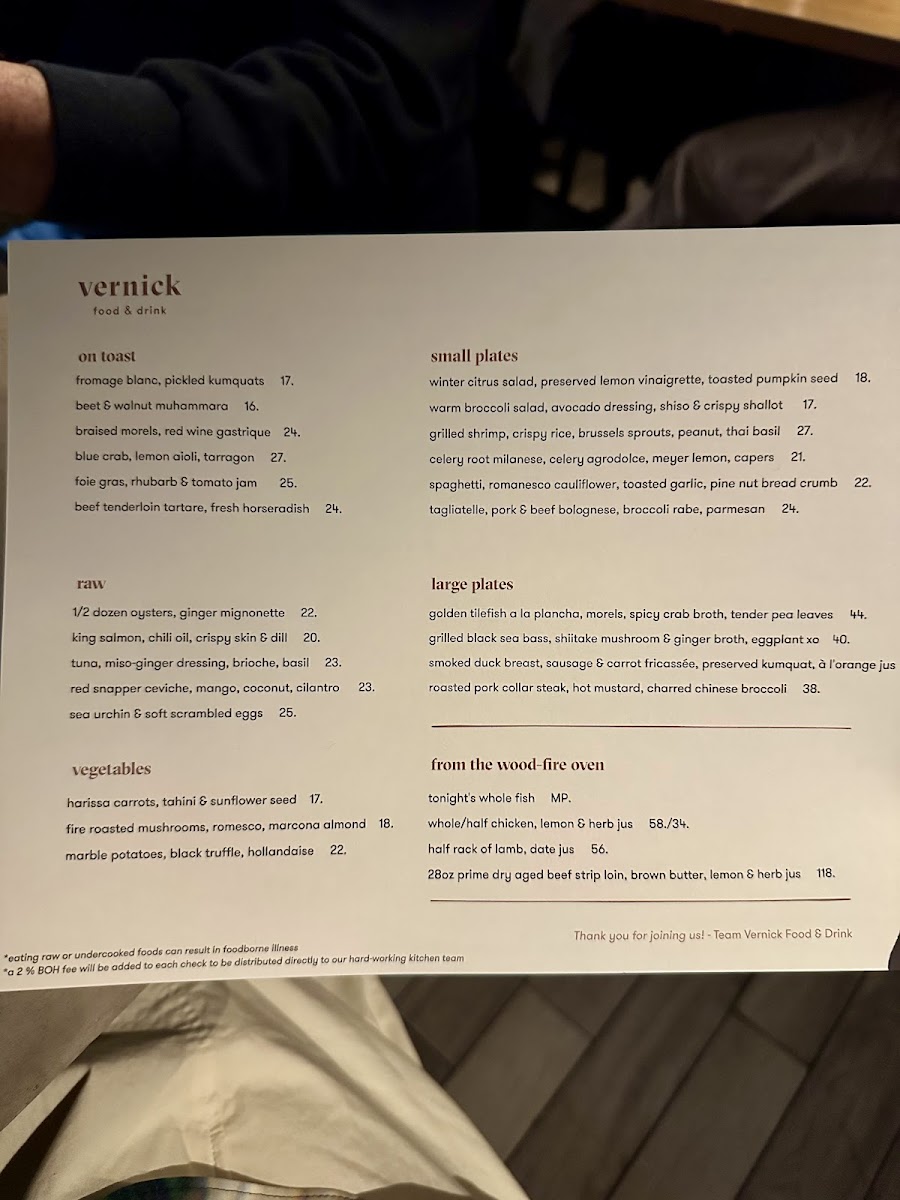 One of the standout features of Vernick is its diverse menu, which emphasizes innovative dishes crafted with the finest ingredients. For those with an adventurous palate, the small plates offer an array of delightful options such as the shaved fennel caesar with grapes ($13) or the fire roasted prawns with charred eggplant ($20), each bursting with flavor and expertly presented. The large plates come with equally enticing offerings; the grilled black sea bass with tender leeks ($38) is a masterpiece of delicate flavors, while the bison strip loin ($42) promises a hearty, indulgent experience. If you're in for a grand treat, the wood fire oven dishes, like the bone-in "porcelet" chop ($82), are sure to leave a lasting impression.