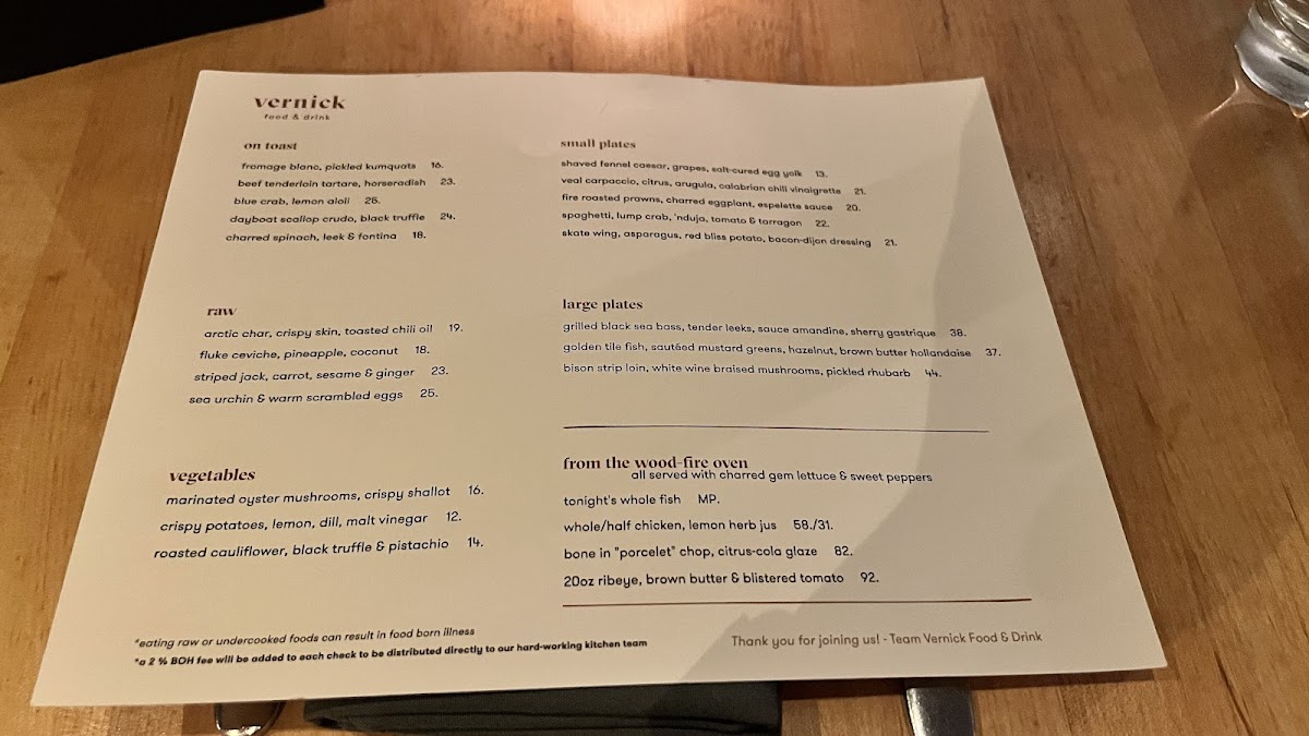 In addition to its incredible menu and atmosphere, Vernick Food & Drink is recognized for its attention to detail and commitment to hospitality, as captured in customer reviews. Whether it's a friendly server who makes you feel right at home or the thoughtful surprises like a complimentary dish, the personal touches add a wonderful dimension to the experience.